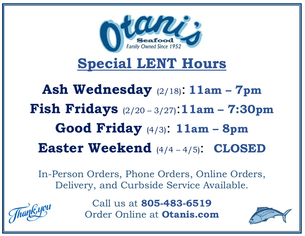 Otani’s Seafood is still operating under our modified Covid hours. We apologize for the inconvenience and appreciate your understanding and patronage.